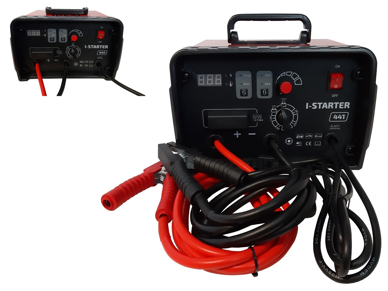 prostownikiem do ładowania 12 i 24 woltowych akumulatorów kwasowych, posiadający funkcję rozruchu samochodów z silnikami benzynowymi oraz diesla.